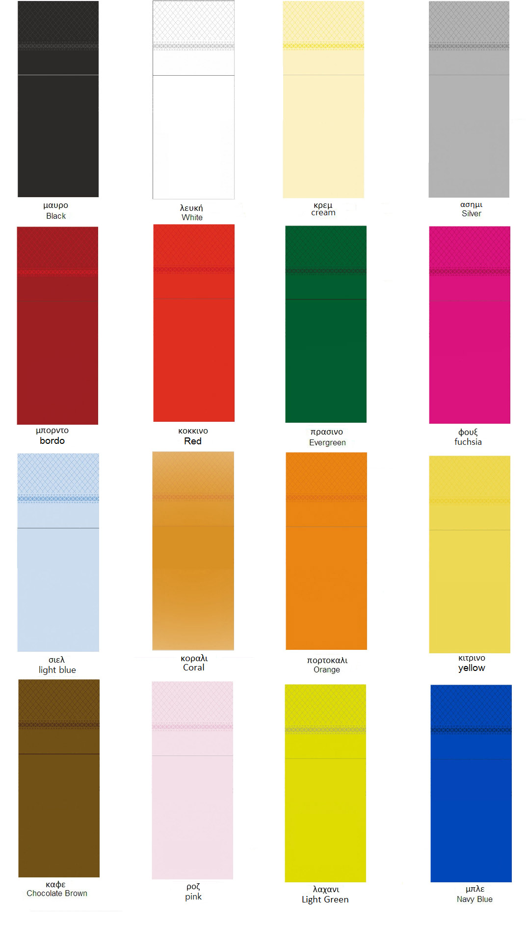 in 16 colors of black, white, cream, gray, brown, burgundy, red, green, fuchsia, pink, silk, apricot, orange, yellow, blue, green.