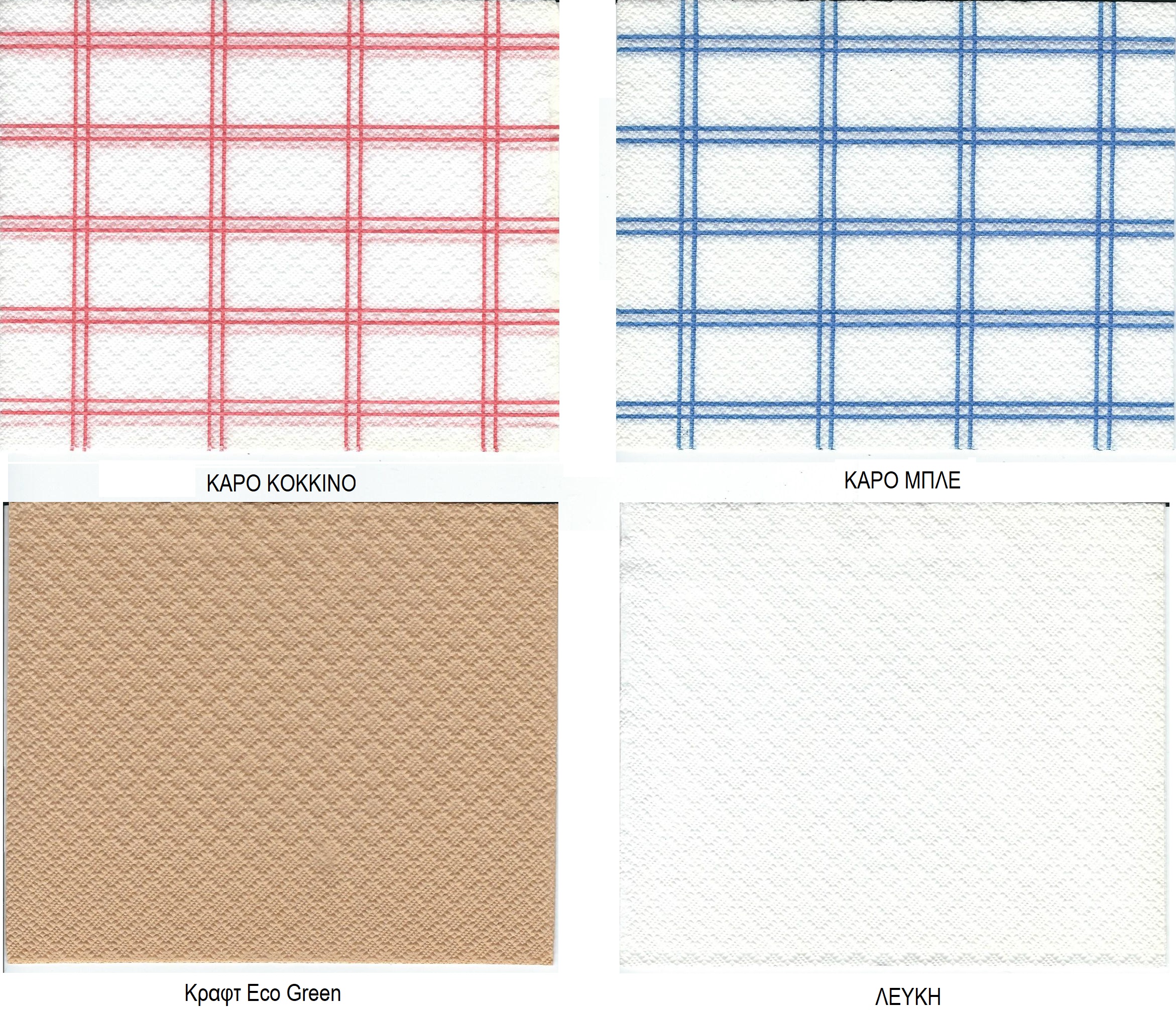 Napkin white design. 28x28cm from very durable and absorbent paper. The product is produced in four different white,kraft, designs,Eco Green White Plaid Red and Blue. Available in 560 sheets per package. 5 packages / box - Pallet: 35 cases.